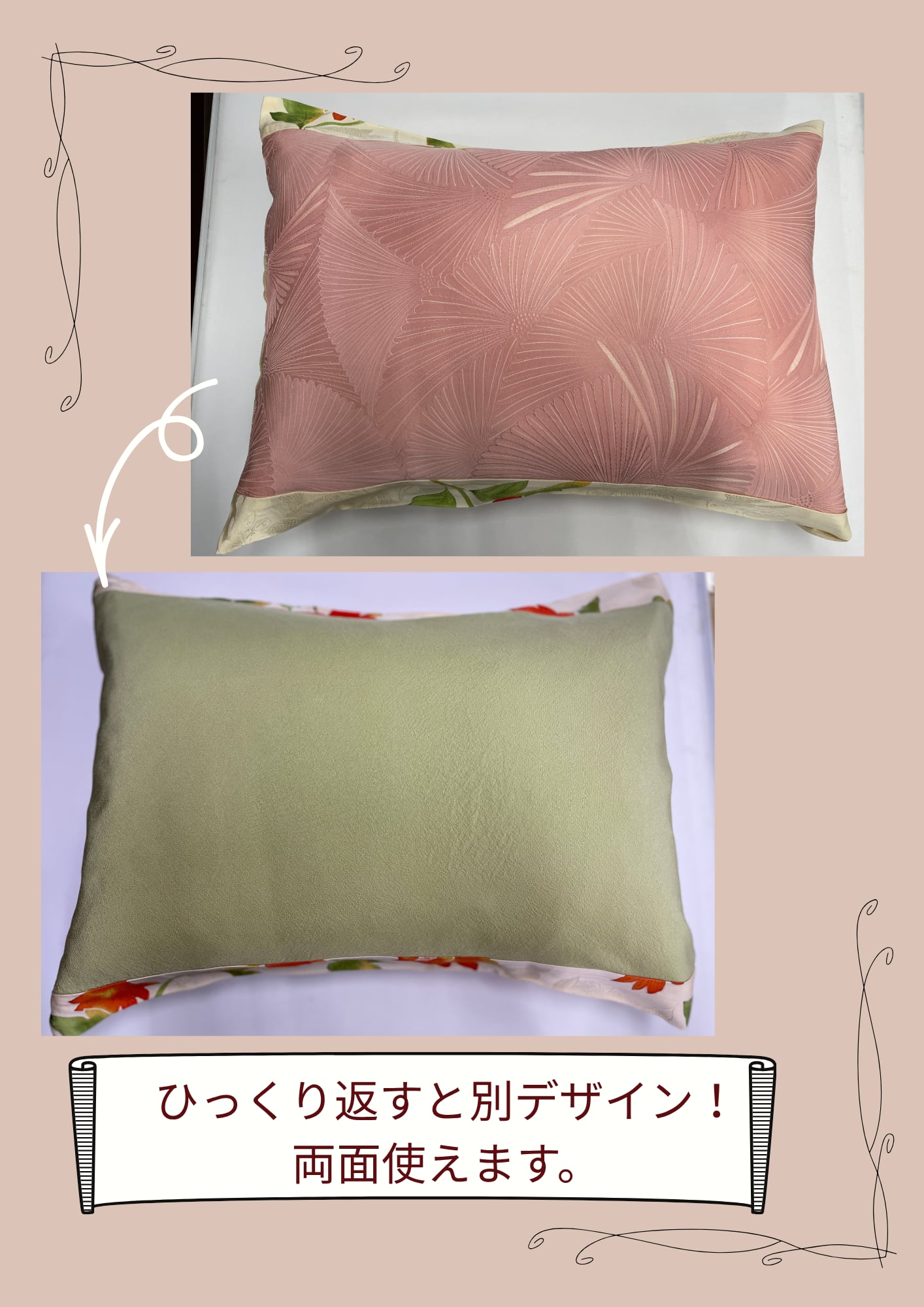 国産の着物をリメイクし、シルク100%で仕立てた枕カバーです。髪の摩擦やお肌の乾燥をやさしく防ぎ、翌朝の美しさを守ります。一点ものの柄からお好きなデザインを選べる、特別な眠りのパートナー。
