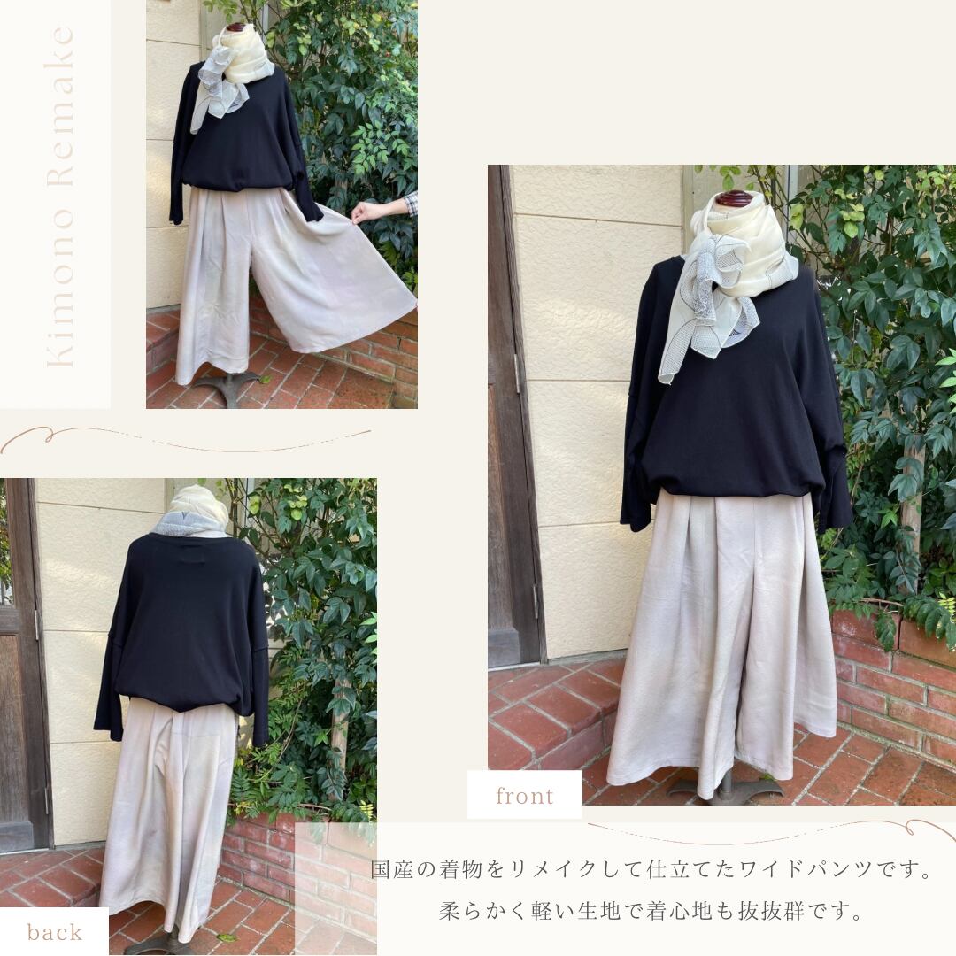 日本の伝統が息づく、セミオーダーの着物リメイクワイドパンツです。正絹素材を使用し、一点ものならではの独自のデザインが魅力的。柔らかな風合いとしっかりとした作りが、心地よい履き心地を実現しています。